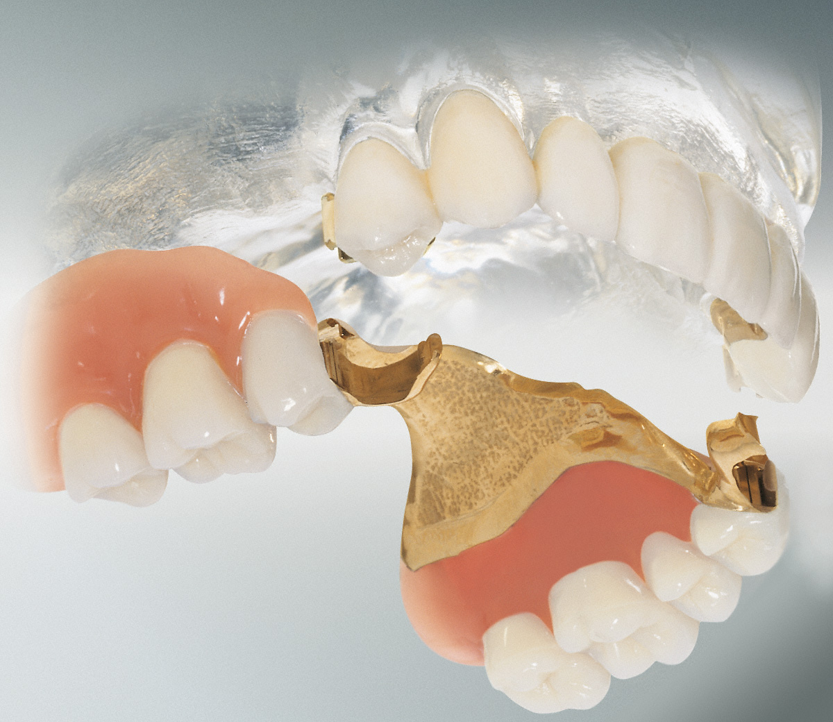 Fehlen mehrere Zähne im Kiefer, besteht auch die Möglichkeit eines herausnehmbaren Zahnersatzes. Er wird mit Hilfe von Verbindungselementen wie Klammern, Geschiebe, Stege oder Doppelkronen (Teleskoparbeiten) an den verblieben Zähnen befestigt. Auch hier können mit Hilfe von Implantaten weitere Befestigungspfeiler geschaffen werden, um einen optimalen Halt der Prothese zu ermöglichen.