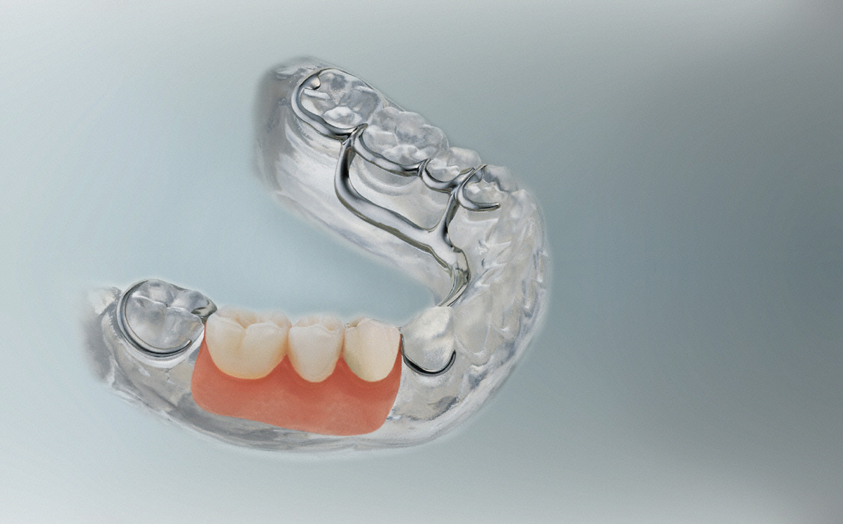 Fehlen mehrere Zähne im Kiefer, besteht auch die Möglichkeit eines herausnehmbaren Zahnersatzes. Er wird mit Hilfe von Verbindungselementen wie Klammern, Geschiebe, Stege oder Doppelkronen (Teleskoparbeiten) an den verblieben Zähnen befestigt. Auch hier können mit Hilfe von Implantaten weitere Befestigungspfeiler geschaffen werden, um einen optimalen Halt der Prothese zu ermöglichen.